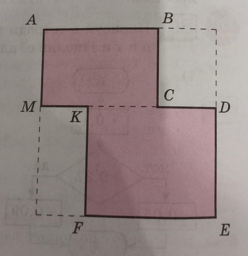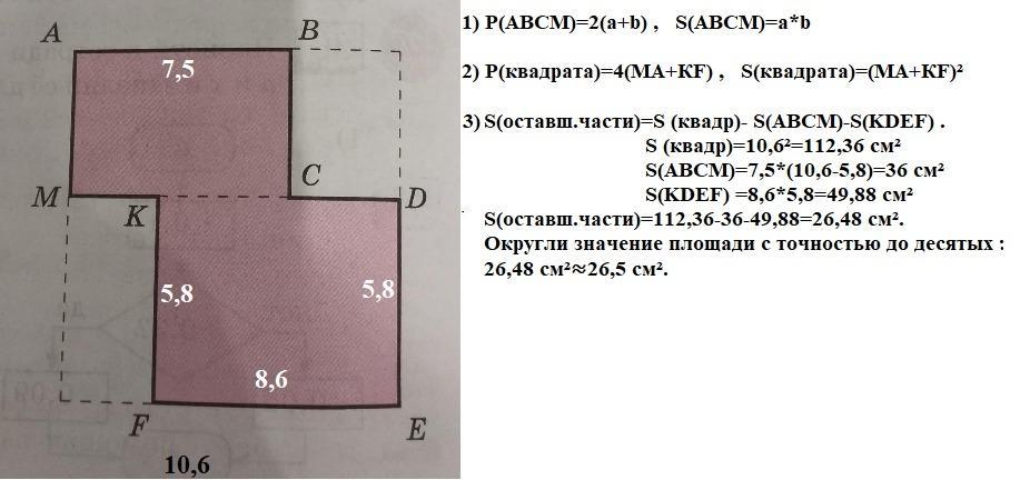 3) из квадрата со стороной 10,6 см выре- K зали два прямоугольника, как показано на чертеже. Известны длины отрезков AB = 7,5 см, DE = KF = 5,8 см, EF = 8,6 см. Найди периметр и площадь получившейся фигуры. Округли значение площади с точ- ностью до десятых. E F
