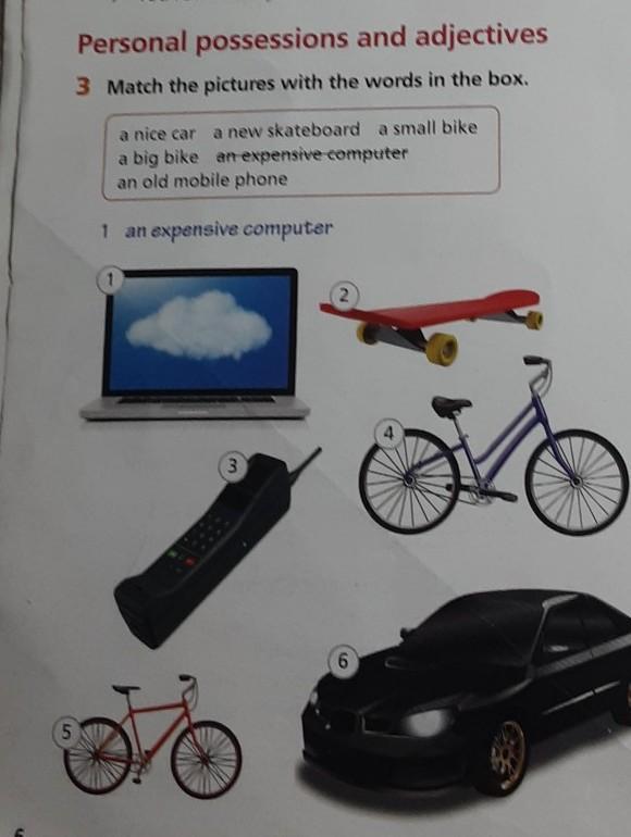 Personal possessions and adjectives 3 Match the pictures with the words in the box. a nice car a new skateboard a small bike a big bike an expensive computer an old mobile phone 1 an expensive computer