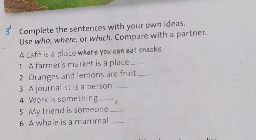 complete the sentences with your own ideas. use who,where, or which. compare with a partner