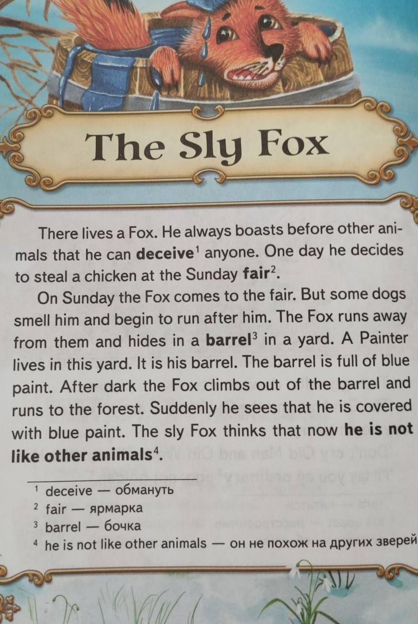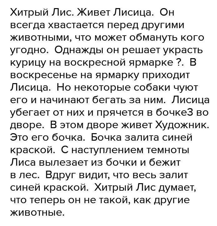 Хитрый Лис. Живет Лисица. Он всегда хвастается перед другими животными, что может обмануть кого угодно. Однажды он решает украсть курицу на воскресной ярмарке ?. В воскресенье на ярмарку приходит Лисица. Но некоторые собаки чуют его и начинают бегать за ним. Лисица убегает от них и прячется в бочке3 во дворе. В этом дворе живет Художник. Это его бочка. Бочка залита синей краской. С наступлением темноты Лиса вылезает из бочки и бежит в лес. Вдруг видит, что весь залит синей краской. Хитрый Лис думает, что теперь он не такой, как другие животные.