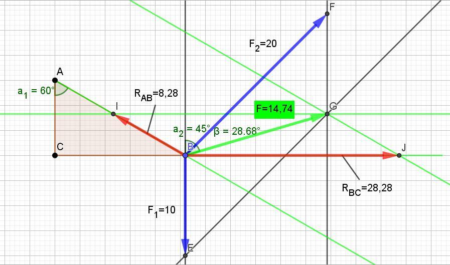 Усилия на стержнях определены по теореме синусов с учётом угла β = 28,67505 градуса.