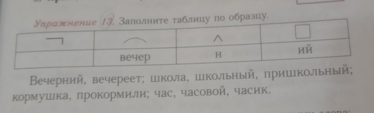 вечерний , вечереет ; школа , пришкольный; кормушка , прокормили ; час , часовой , часик.