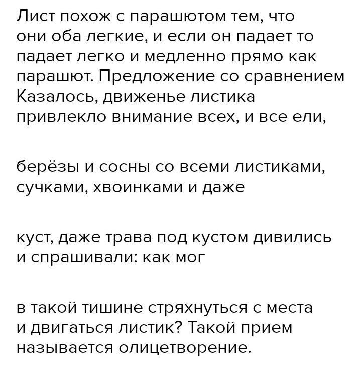 21 Прочитайте текст. Скажите, почему писатель называет листок пара- шютом. В чём сходство листа с парашютом? Найдите предложения. в которых природа изображена как живая. Как называется этот ху дожественный приём? осин ocu ocus Парашют В тишине с берёзы слетел медленно вниз жёлтый листок. Он слетел в такой тишине, когда и осиновый листок не шевелится. Казалось, движенье листика привлекло внимание всех, и все ели, берёзы и сосны со всеми листиками, сучками, хвоинками и даже куст, даже трава под кустом дивились и спрашивали: как мог в такой тишине стряхнуться с места и двигаться листик? И, пови- нуясь всеобщей просьбе узнать, сам ли собой сдвинулся листок, я пошёл к нему и узнал. Нет, не сам сдвинулся листок: это паук, желая спуститься, отяжелил его и сделал своим парашютом. (М. М. Пришвин) «Толстые вопросы Ka Тонкие вопросы