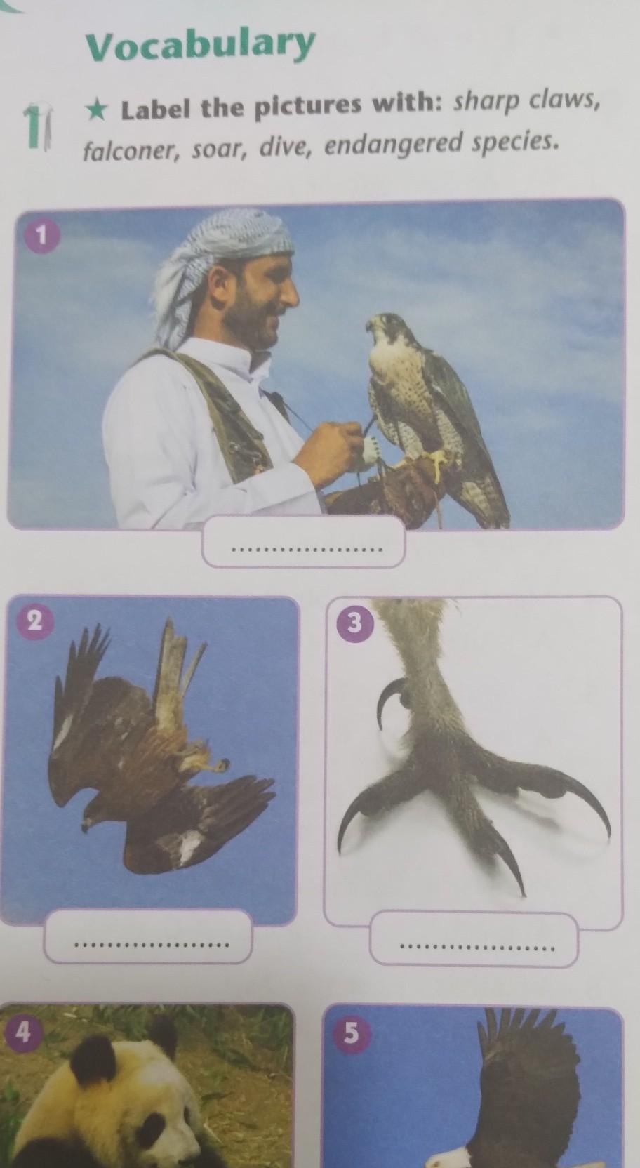 Label the pictures with:sharp claws,falconer,soar,dive, endangered species.