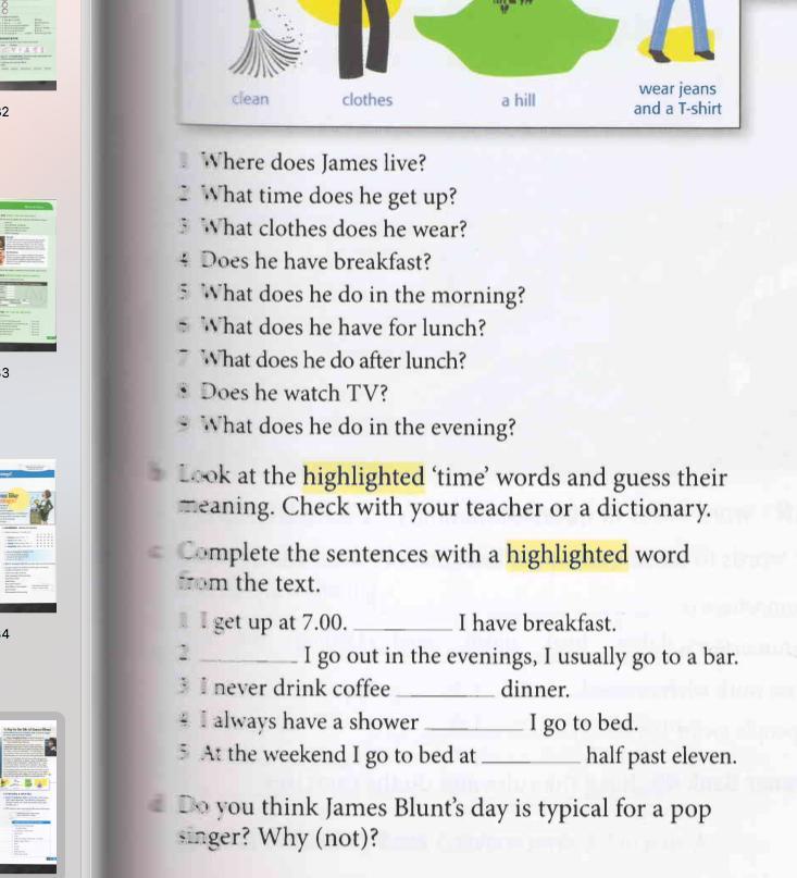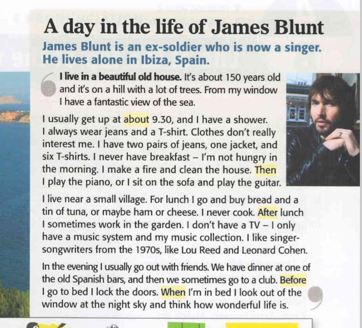 Объяснение:Один день из жизни Джеймса Бланта Джеймс Блант - бывший солдат, ныне певец. Он живет один на Ибице, Испания. Я живу в красивом старинном доме. Ему около 150 лет, и он находится на холме с множеством деревьев. Из моего окна открывается фантастический вид на море. Обычно я встаю около 9.30 и принимаю душ. Я всегда ношу джинсы и футболку. Одежда меня особо не интересует. У меня есть две пары джинсов, одна куртка и шесть футболок. Я никогда не завтракаю - утром не голоден. Разжигаю огонь и убираю дом. Затем я играю на пианино или сижу на диване и играю на гитаре. Я живу недалеко от небольшой деревни. На обед я иду купить хлеба и банку тунца, а может быть, ветчину или сыр. Я никогда не готовлю. После обеда иногда работаю в саду. У меня нет телевизора - у меня есть только музыкальный центр и моя музыкальная коллекция. Мне нравятся авторы песен 1970-х, такие как Лу Рид и Леонард Коэн. Вечером я обычно гуляю с друзьями. Мы ужинаем в одном из старых испанских баров, а потом иногда ходим в клуб. Перед сном я запираю двери. Когда я лежу в постели, я смотрю в окно на ночное небо и думаю, как прекрасна жизнь.