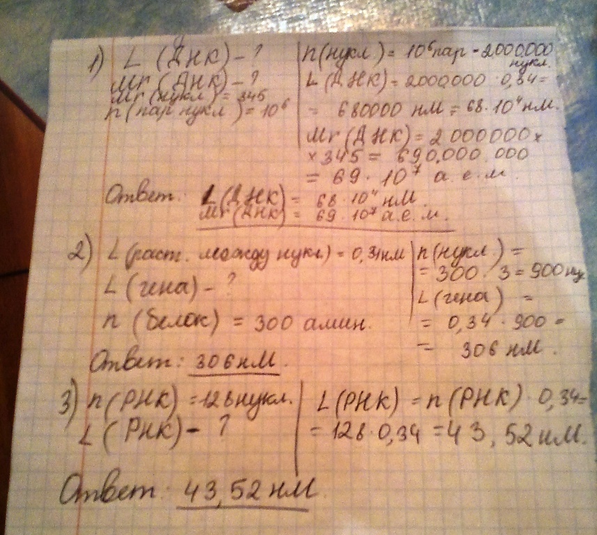 1)Вычислить длину и молекулярную массу молекулы ДНК, если известно,что она включает 10^6 пар нуклеотидов.