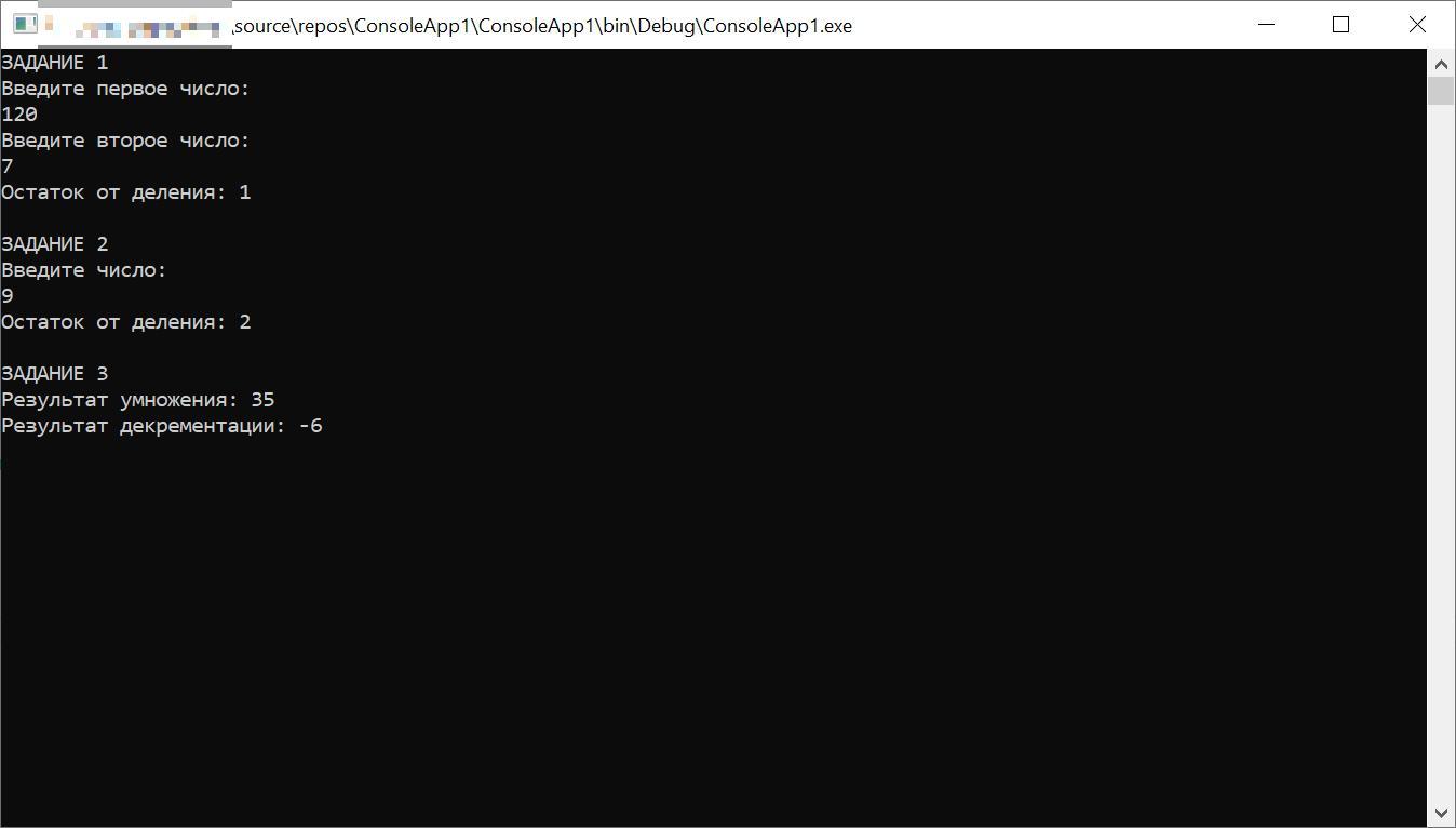 Console.WriteLine("Остаток от деления: " + Number1 % Number2);