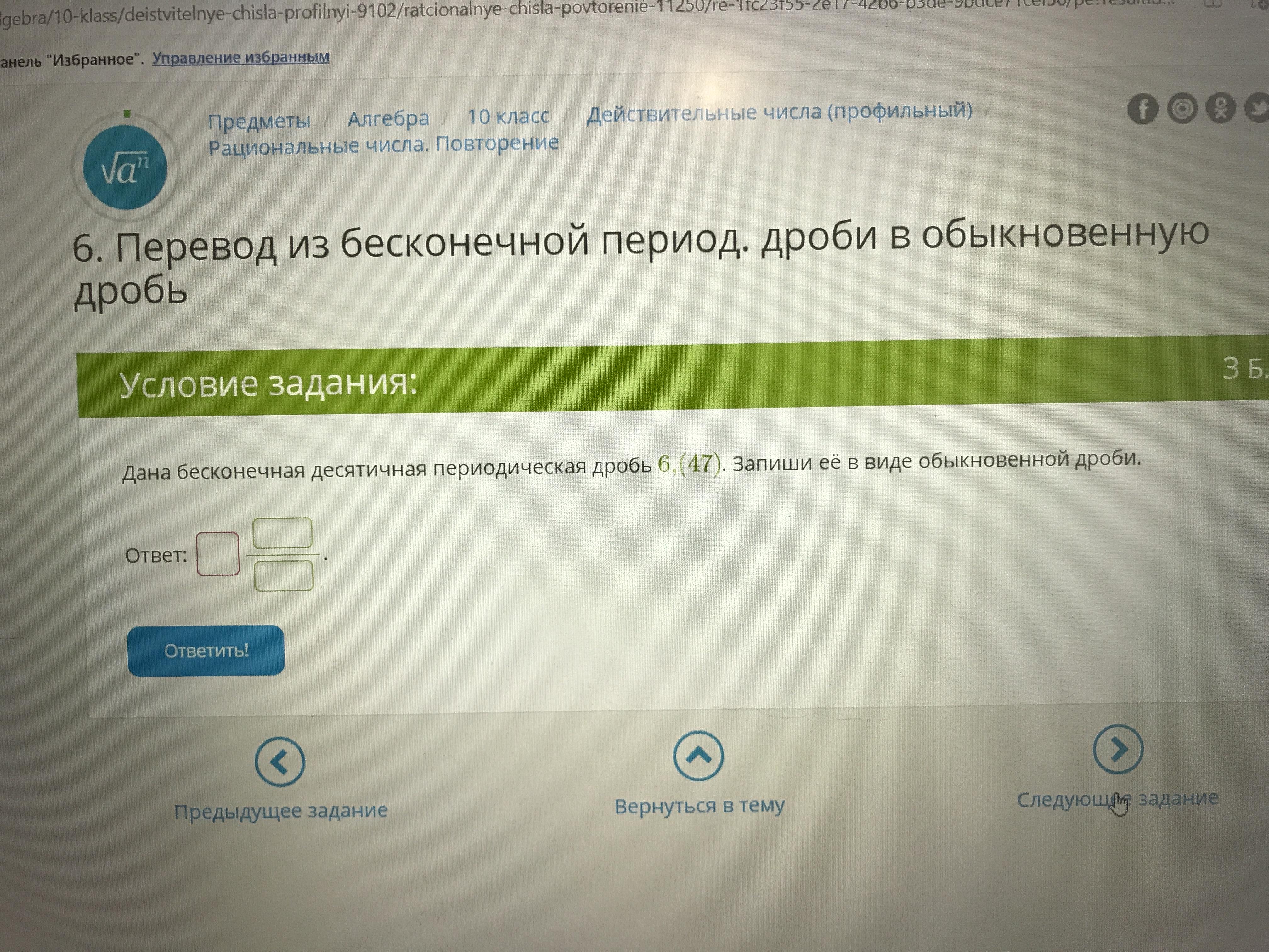 В числителе - период, в знаменателе столько девяток, сколько цифр в периоде. Целая часть остается неизменной.