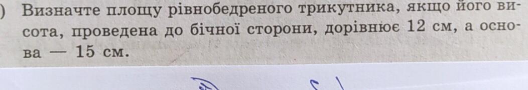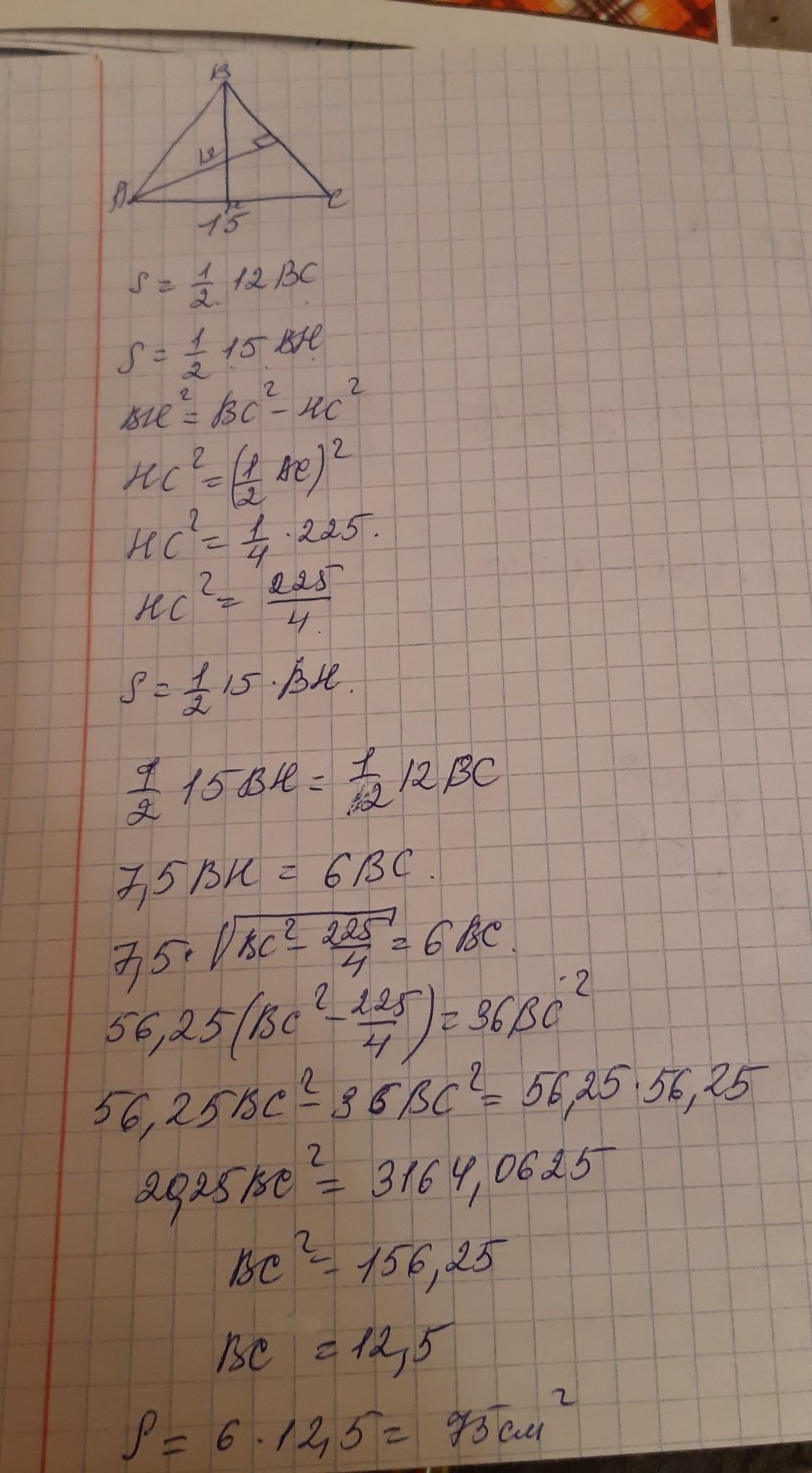 Визначити площу рівнобедреного трикутника Якщо його висота проведена До бічної сторони дорівнює 12 см а основа 15