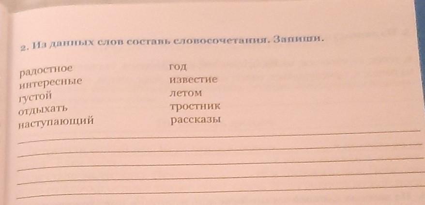 Из данных слов составь словосочетания. Запиши. радостное интересные густой отдыхать наступающий год известие летом тростник рассказы