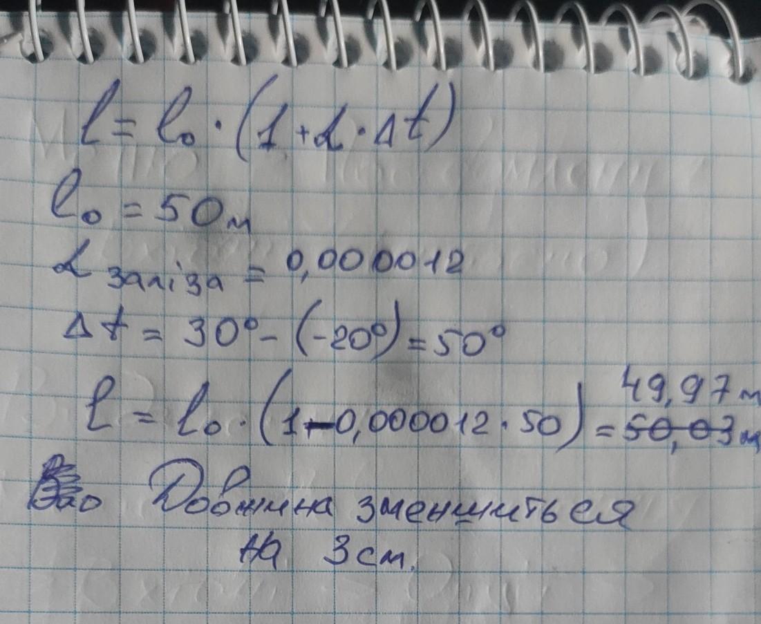 Влітку при температурі 30 градусів задізний провід між двоиа стовпами електро передачі має довжину 50 метрів. На скільки зміниться його довжина при температурі -20 градусів