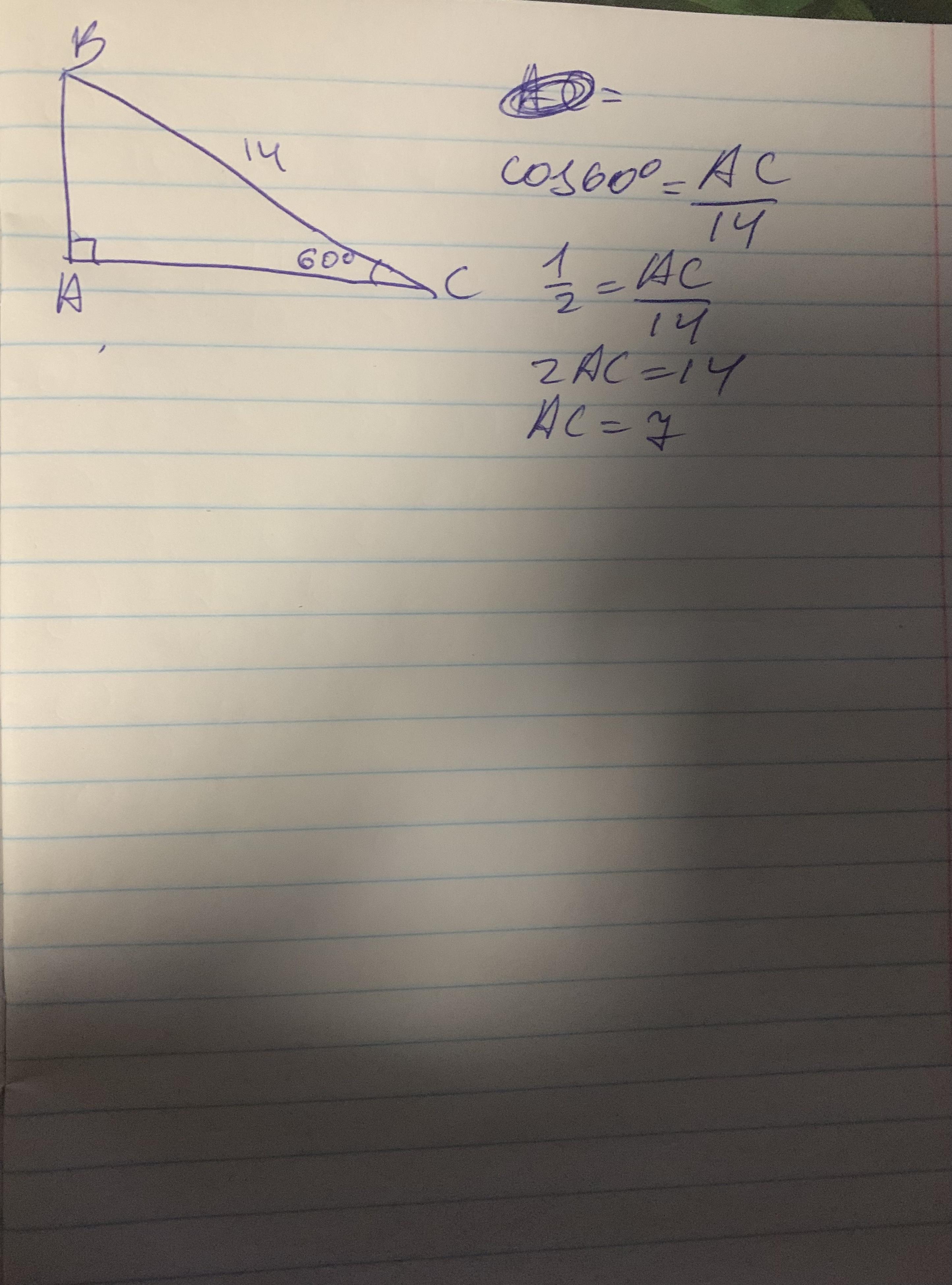 У прямокутному трикутнику гострий кут дорівнює 60°, а гіпотенуза - 14см. Знайти катет, що прилягає до цього кута. СРОЧНО