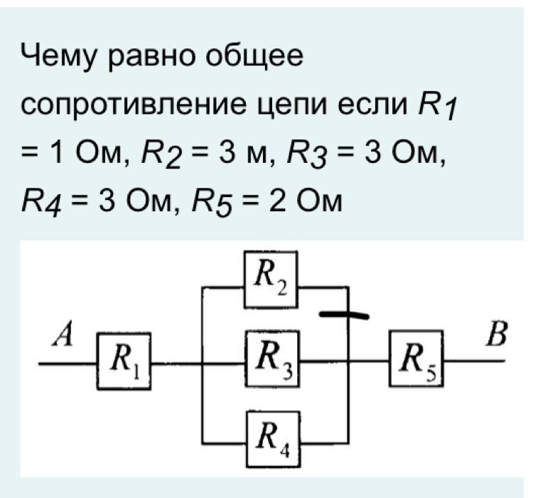 Rобщ = R1+(1/R2+1/R3+1/R4) + R5 = 1 + 1 + 2 = 4 Ом