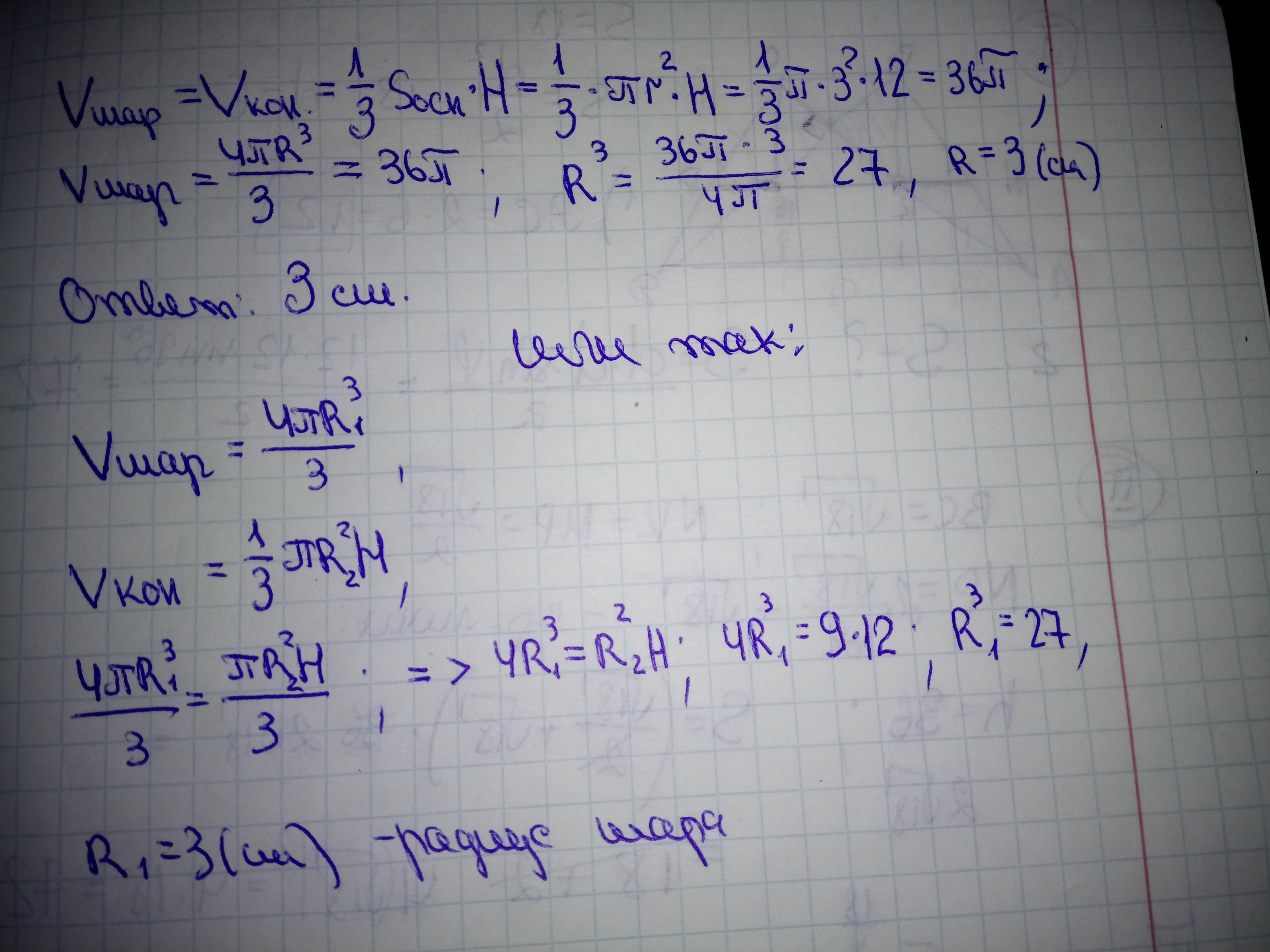 Найдите радиус металлического шарика, полученного в результате переплавки конуса, высота которого равна 12 см, а радиус основания – 3 см. Потерями металла при плавлении пренебречь.