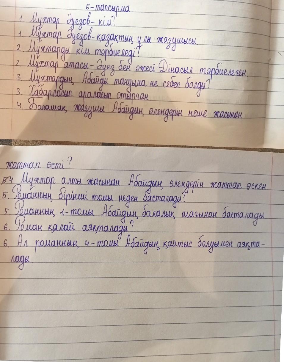 Айтылым 6-тапсырма. Сұрақтарға жауап бер. 1. Мұхтар Әуезов — кім? 2. Мұхтарды кім тәрбиеледі? 3. Мұхтардың Абайды тануына не себеп болды? 4. Болашақ жазушы Абайдың өлеңдерін неше жасынан жаттап өсті? 5. Романның бірінші томы неден басталады? 6. Роман қалай аяқталады?
