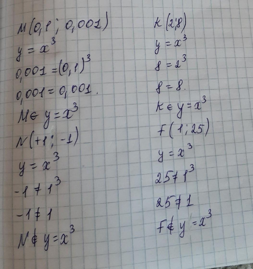 8. Какие из следующих точек: M(0,1; 0,001), N(1; — 1), К(2; 8), F(1; 25) принадлежат графику функции y = x^3?