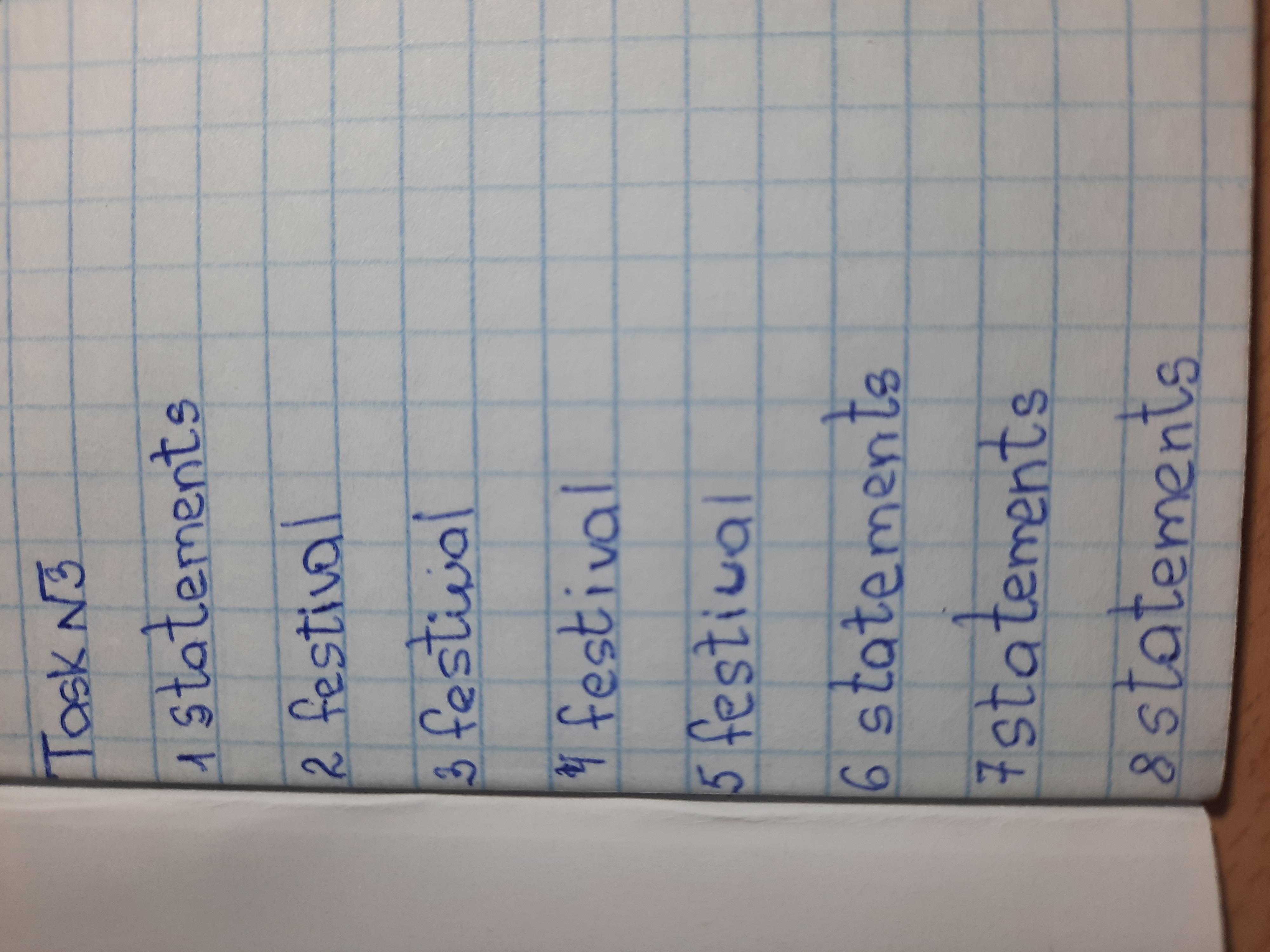 Listen again and match the festivals with the statements (1–8). 1 Warm clothes are recommended. 2 The place changes completely. 3 There’s a lot of noise. 4 There’s a lot of dressing up. 5 There’s singing and dancing. 6 It’s better at night. 7 It can get a little frightening. 8 You can do a sport as well.