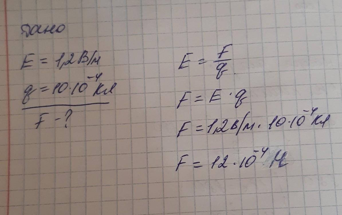 На листочке подробно: определить силе с которой действует электрическое поле на заряд 10*10(-4) степени Кл. Напряжённость поля равна 1,2 в/м
