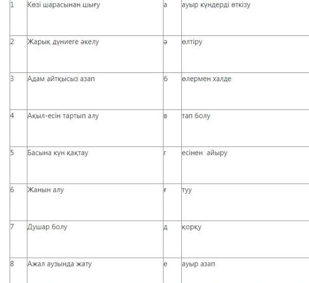 төменде берілген тұрақты сөз тіркестерін мағынасымен сәйкестендіріңіздер.