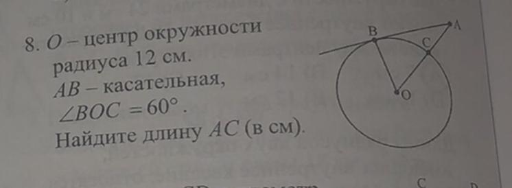 катет против угла 30градусов =12см т.к. это радиус, (это ВО), значит АО в 2 раза больше = 12*2=24см