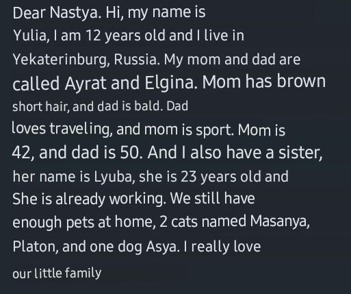 Hi, my name is Julia, I am 12 years old and I live in Yekaterinburg, Russia. My mom and dad are called Airat and Elgina. Mom has short brown hair, and dad is bald. Dad likes traveling, and mom likes sports. Mom is 42, and dad is 50. And I also have a sister, her name is Lyuba, she is 23 years old and She is already working. We still have enough pets at home, 2 cats named Masanya, Plato, and one dog Asya. I really love our little family