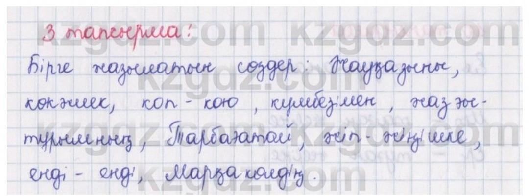 3-тапсырма. Мәтінді оқып, мазмұнын түсіндіріп айт. Бірге және бөлек жа- зылган сөздерге көңіл бөл. Марқаның жағасы ерте кеуіп, ерте көктеді. Жауқазыны қарды жарып шыға беретін тау бөктерінің былтырғыдан қалған күреңсесі күлтеленіп, қаулай тебіндеп келе жатқан көкпен араласып, ала- mабырланып жатыр. Тау ішінде көкжиек жақын болады. Тауда тұрғанда аспан да аласа көрінеді. Сол көктемгі көкжиек қоп-қою жалқынды сағым іркіліп барып, әлгі көк күмбезімен көмкерілген. Жазғытұрымның кірбіңсіз ашық аспаны мөлдіреп, көлде көрініс беріп тұр. Кілкіген жукалаң мұнар арасынан оқшау көрініп, мұнда- мұндалап аппақ болып жататын Тарбағатай шың-құздарын ұзын- нан-ұзақ созылған жіп-жіңішке ақ бұлт екіге бөліп, аспан тауына ұқсайтын. Енді-енді бүршік атып, көктемнің шуағына алақанын жая бастаған орман соңғы нөсерден жаңа ғана ес жиып бусанады. Көктемгі ауада сарай ашар жағымды саумал иісі бар. Сымпылдай ұшып келген бір топ шүрегей Марқакөлдің айдынын төсiмен тіл- гілей қонды да, мамырлап жүзе жөнелді. (О. Бөкей) 9