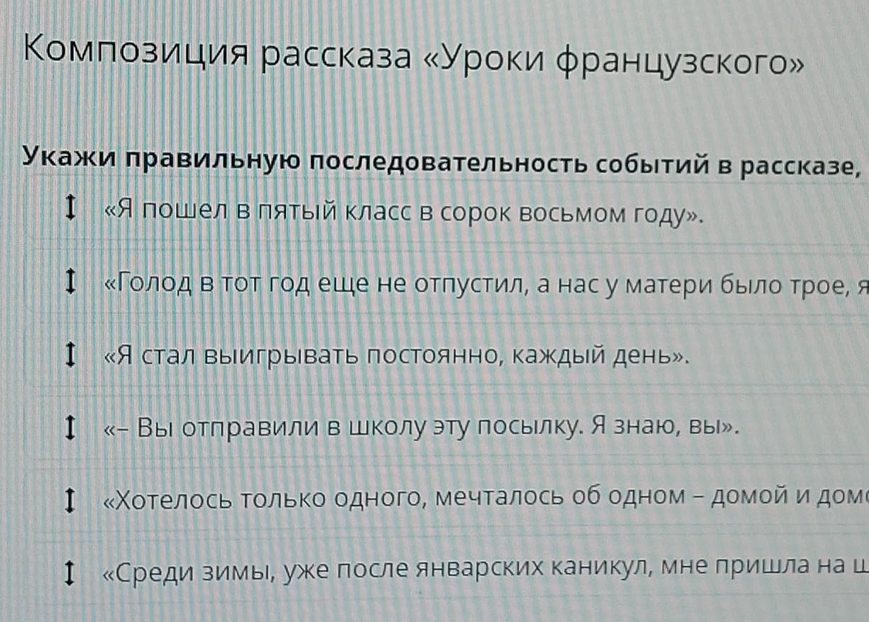 Срочно Даю!!!!!!Даю 50 балловСрочно нужен ответ !!!!! Композиция !рассказа «Уроки французского» Укажи правильную последовательность событий в рассказе, опираясь на цитаты. І «Я пошел в Пятый класс в сорок восьмом году». 1 «Голод в тот год еще не отпустил, а нас у матери было трое, я самый старший». т 1 «Я стал выигрывать постоянно, каждый день». 1 «— Вы отправили в школу эту посылку. Я знаю, ВЫ». І «Хотелось только одного, мечталось об одном – домой и домой», 1 «Среди зимы, уже после январских каникул, мне пришла на школу по почте посылка».