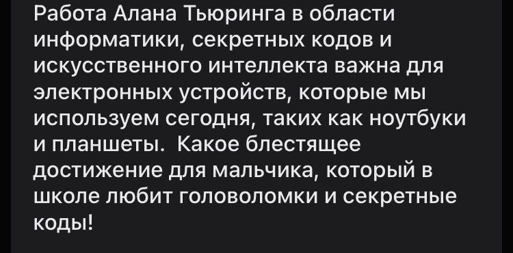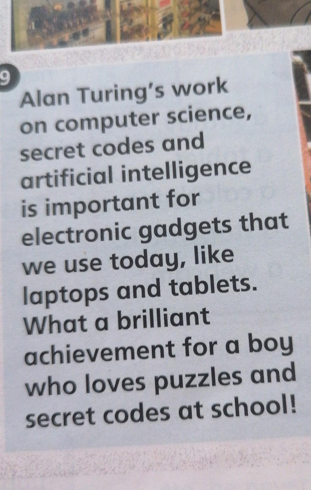 Alan Turing's work on computer science, secret codes and artificial intelligence is important for electronic gadgets that we use today, like laptops and tablets. What a brilliant achievement for a boy who loves puzzles and secret codes at school!