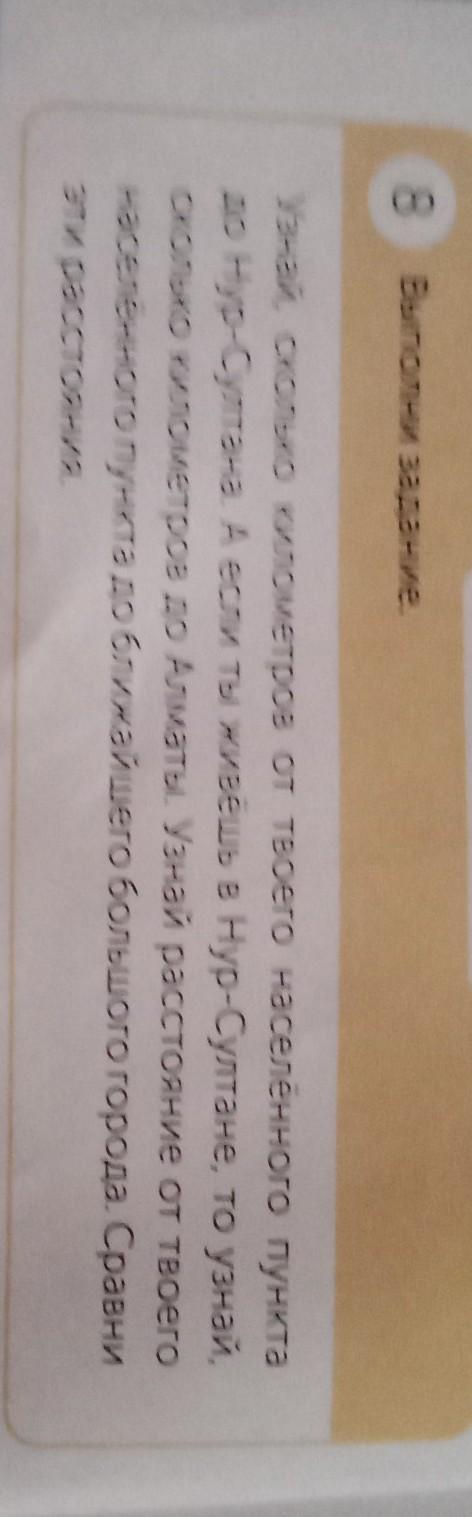 8 Выполни задание. Узнай, сколько километров от твоего населённого пункта до Нур-Султана. А если ты живёшь в Нур-Султане, то узнай, сколько километров до Алматы. Узнай расстояние от твоего населённого пункта до ближайшего большого города. Сравни эти расстояния. помогите плисс 4 класс.. дам много балов
