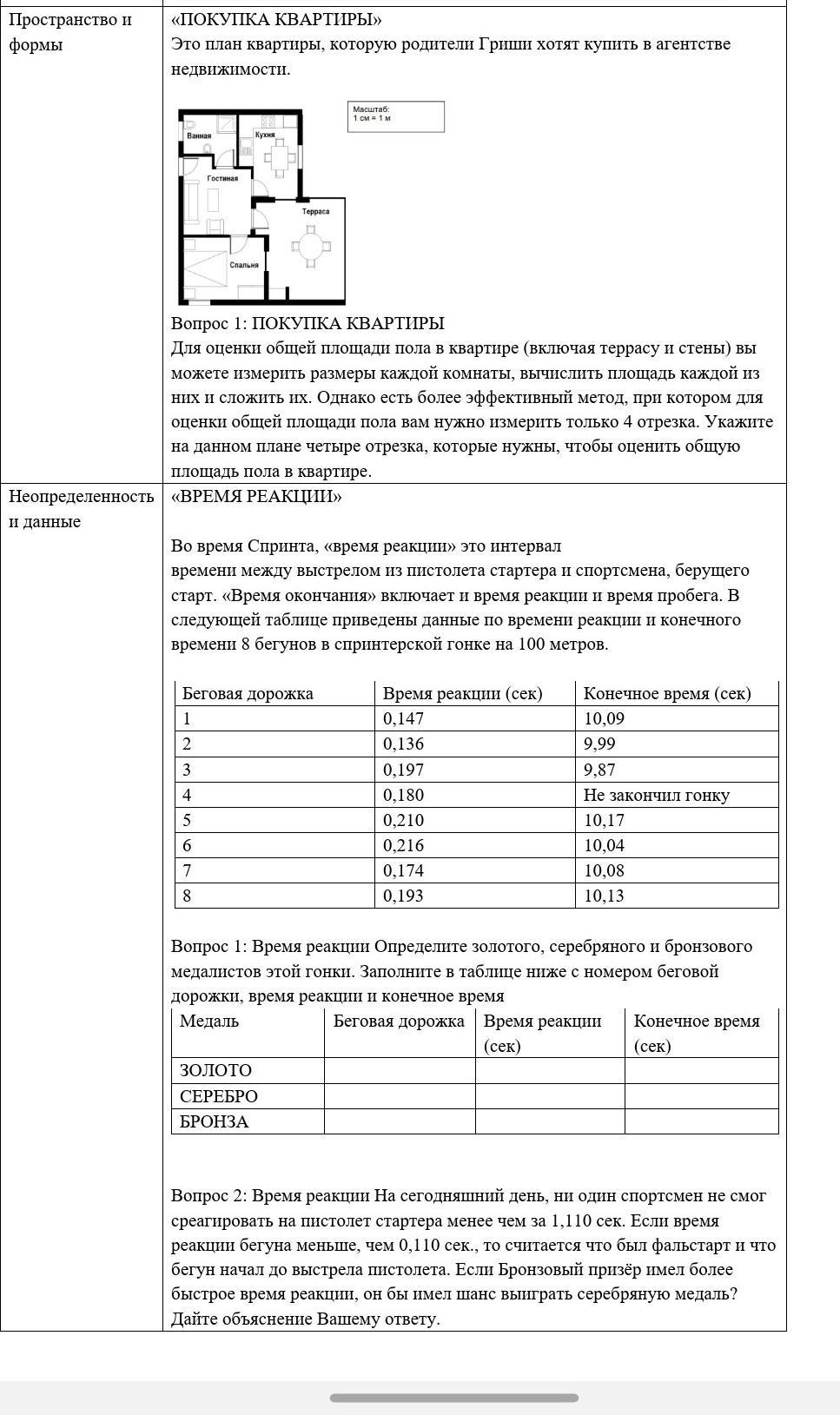 «ПОКУПКА КВАРТИРЫ» Это план квартиры, которую родители Гриши хотят купить в агентстве недвижимости.  Вопрос 1: ПОКУПКА КВАРТИРЫ Для оценки общей площади пола в квартире (включая террасу и стены) вы можете измерить размеры каждой комнаты, вычислить площадь каждой из них и сложить их. Однако есть более эффективный метод, при котором для оценки общей площади пола вам нужно измерить только 4 отрезка. Укажите на данном плане четыре отрезка, которые нужны, чтобы оценить общую площадь пола в квартире. «ВРЕМЯ РЕАКЦИИ» Во время Спринта, «время реакции» это интервал времени между выстрелом из пистолета стартера и спортсмена, берущего старт. «Время окончания» включает и время реакции и время пробега. В следующей таблице приведены данные по времени реакции и конечного времени 8 бегунов в спринтерской гонке на 100 метров. Беговая дорожка Время реакции (сек) Конечное время (сек) 1 0,147 10,09 2 0,136 9,99 3 0,197 9,87 4 0,180 Не закончил гонку 5 0,210 10,17 6 0,216 10,04 7 0,174 10,08 8 0,193 10,13 Вопрос 1: Время реакции Определите золотого, серебряного и бронзового медалистов этой гонки. Заполните в таблице ниже с номером беговой дорожки, время реакции и конечное время Медаль Беговая дорожка Время реакции (сек) Конечное время (сек) ЗОЛОТО СЕРЕБРО БРОНЗА Вопрос 2: Время реакции На сегодняшний день, ни один спортсмен не смог среагировать на пистолет стартера менее чем за 1,110 сек. Если время реакции бегуна меньше, чем 0,110 сек., то считается что был фальстарт и что бегун начал до выстрела пистолета. Если Бронзовый призёр имел более быстрое время реакции, он бы имел шанс выиграть серебряную медаль? Дайте объяснение Вашему ответу.
