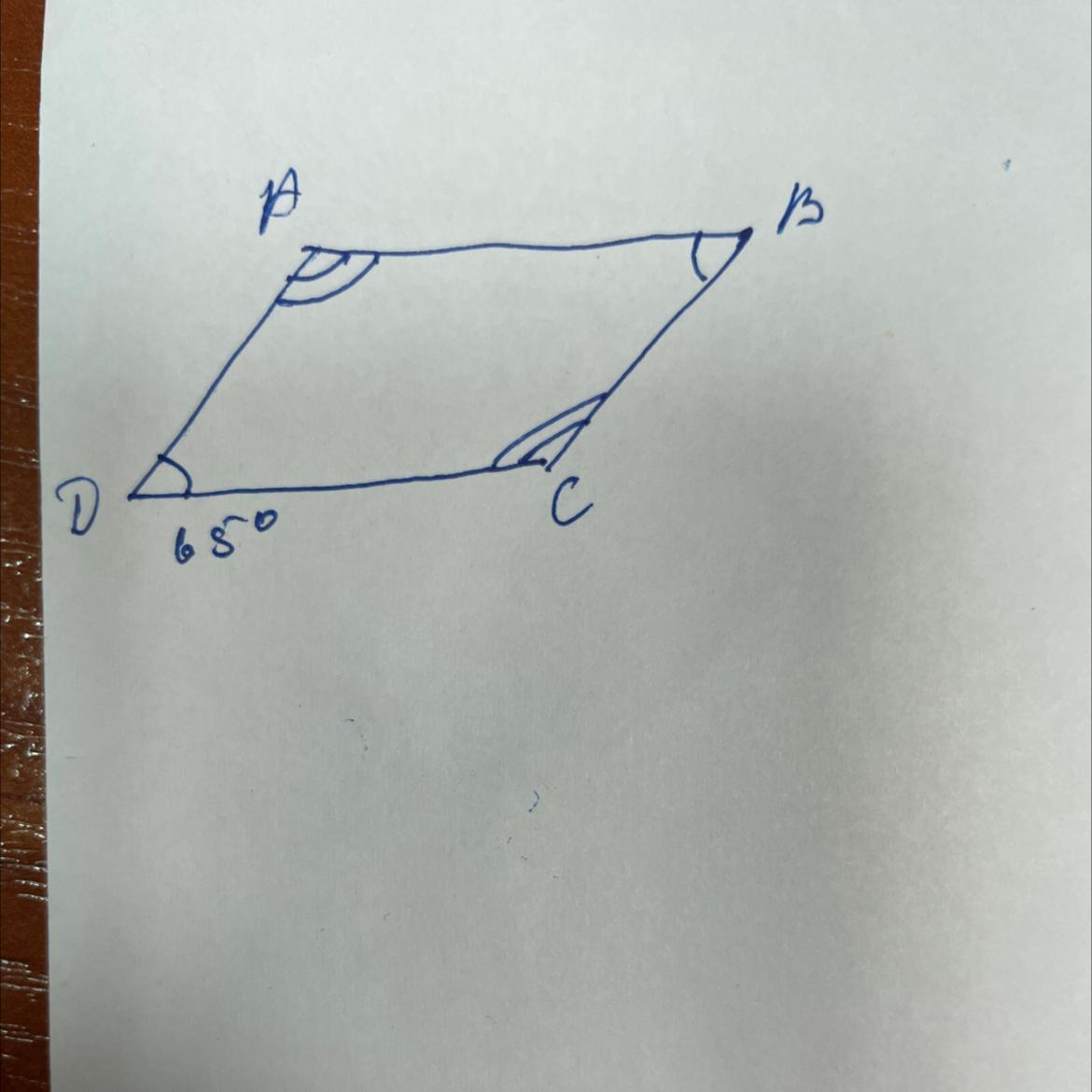 ∠ В =∠ D=65°, углы А и В прилежат ко одной стороне АВ, поэтому их сумма 180°⇒∠А=180°-65°=115°; ∠С=115°