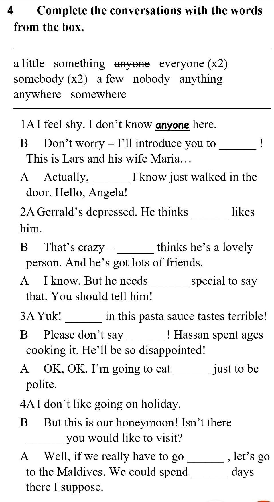 4 Complete the conversations with the words from the box. a little something anyone everyone (x2) somebody (x2) a few nobody anything anywhere somewhere 1AI feel shy. I don't know anyone here. Don't worry - I'll introduce you to This is Lars and his wife Maria... A I know just walked in the Actually, door. Hello, Angela! 2A Gerrald's depressed. He thinks likes him. That's crazy - thinks he's a lovely person. And he's got lots of friends. A I know. But he needs special to say that. You should tell him! 3A Yuk! Please don't say in this pasta sauce tastes terrible! ! Hassan spent ages cooking it. He'll be so disappointed! OK, OK. I'm going to eat polite. A just to be 4A I don't like going on holiday. But this is our honeymoon! Isn't there you would like to visit? , let's go Well, if we really have to go to the Maldives. We could spend there I suppose. A days
