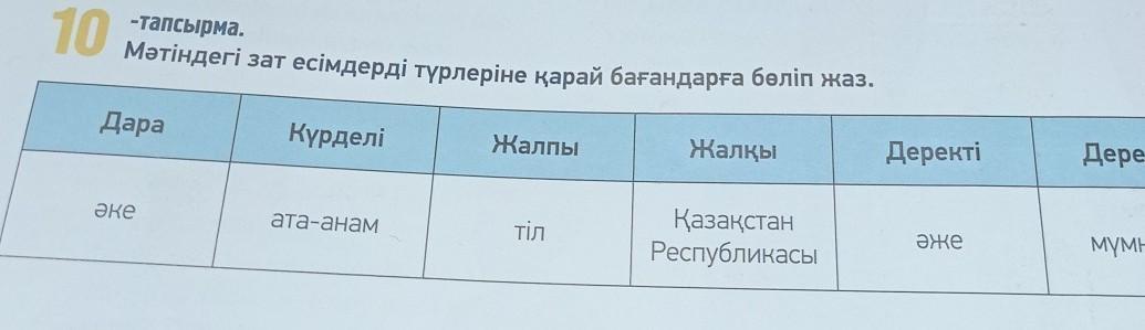 Мәтіндегі зат есімдерді түрлеріне қарай бағандарға бөліп жаз.