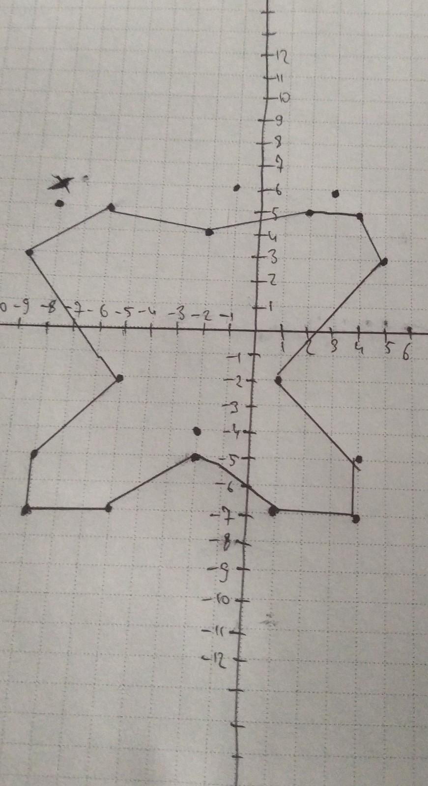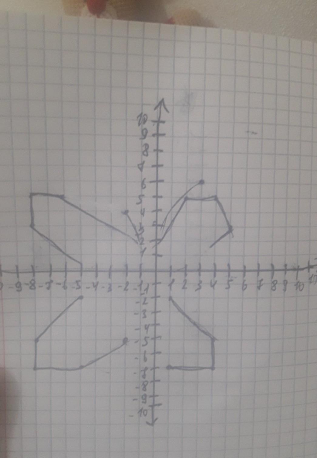 На листке в клеточку построить фигуру ("Бабочка") по точкам со следующими координатами: (-2;-5), (-5;-7), (-8;-7), (-8;-5), (-5;-2), (-9,3), (-8;5), (-6;5), (-2;4), (2;5), (4;5), (5,3), (1;-2), (4;-5), (4;-7), (1;-7), (-2;-5) Усики: (-2;4), (3;6) (-2;4), (-1;6) помогите пж срочно очень, умоляю, я все помогаю, мне никто...
