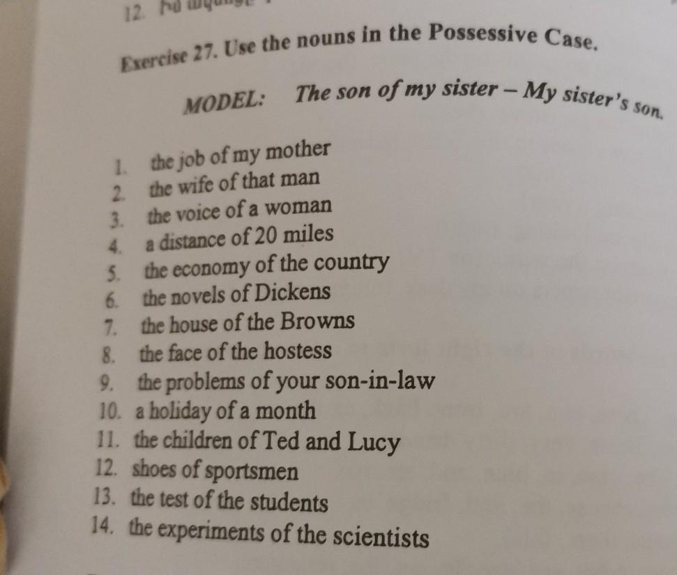 MODEL: 1. the job of my mother 2. the wife of that man 3. the voice of a woman 4. a distance of 20 miles 5. the economy of the country 6. the novels of Dickens 7. the house of the Browns 8. the face of the hostess 9. the problems of your son-in-law 10. a holiday of a month 11. the children of Ted and Lucy 12. shoes of sportsmen 13. the test of the students 14. the experiments of the scientists