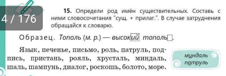 Язык(м.р) - длинный язык, печенье (с.р) - вкусное печенье, письмо(с.р) - долгожданное письмо, роль(ж.р) - театральная роль, патруль(м.р) - полицейский патруль, подпись(ж.р) - сложная подпись, пристань(ж.р) старая пристань, рояль(м.р) блестящий рояль, хрусталь(м.р) хрупкий хрусталь, миндаль(м. р) вкусный миндаль, шаль(ж,р) шерстяная шаль, шампунь(м.р) натуральный шампунь, диалог(м.р) интересный диалог, роскошь(ж.р) прекрасная роскошь, болото(с.р) зелёное болото, море(с.р) темное море