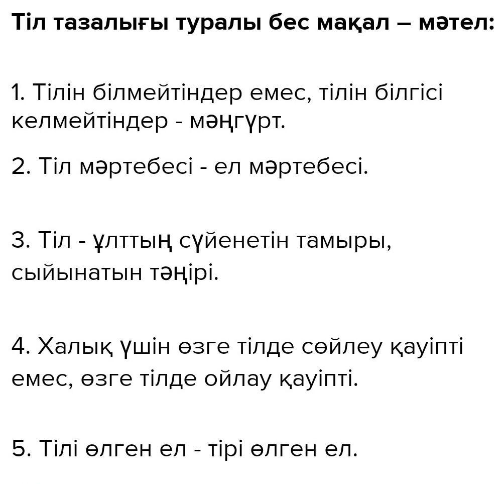 Тіл тазалығы жөнінде бес мақал жазу және мақалдардын негізгі ойды анықтап пікірлерәмен қорытындыдаңдар срочна жауап керек