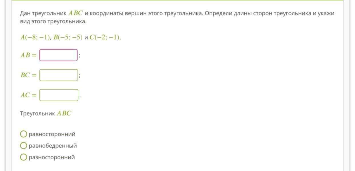 Дан треугольник ABC и координаты вершин этого треугольника. Определи длины сторон треугольника и укажи вид этого треугольника.