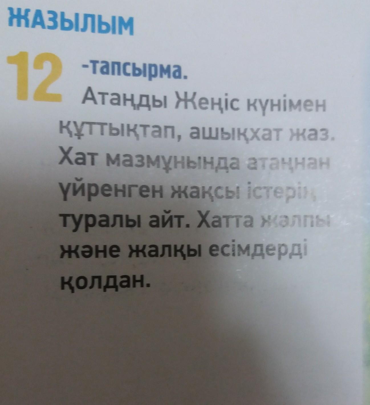 - Атаңды Жеңіс күнімен құттықтап, ашықхат жаз. Хат мазмұнында атаңнан үйренген жақсы істерің туралы айт. Хатта жалпы және жалқы есімдерді қолдан.