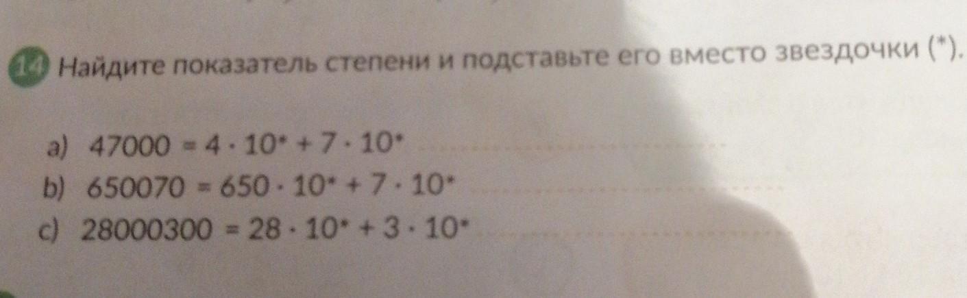 Найдите показатель степени и подставьте его место звездочки a) 47000 - 4.10* +7.10* b) 650070 - 650 - 10* + 7. 10- c) 28000300 = 28-10* + 3. 10-