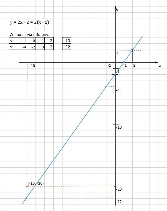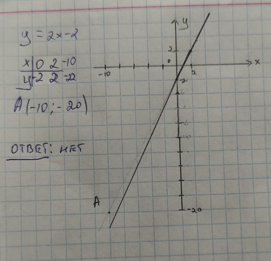 Из чертежа видно, что точка c координатами х = -10, у = - 20 не принадлежит прямой.
