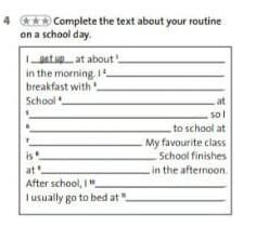 4 Complete the text about your routine on a school day. 1stup at about in the morning. 1. breakfast with School at to school at My favourite class School finishes in the afternoon. is" at After school, I I usually go to bed at