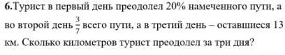 турист в первый день преодалел 20% намеченного пути, а во второй день 3/7 всего пути, а в третий день - оставшиеся 13 км. Сколько км турист преодолел за 3 дня?
