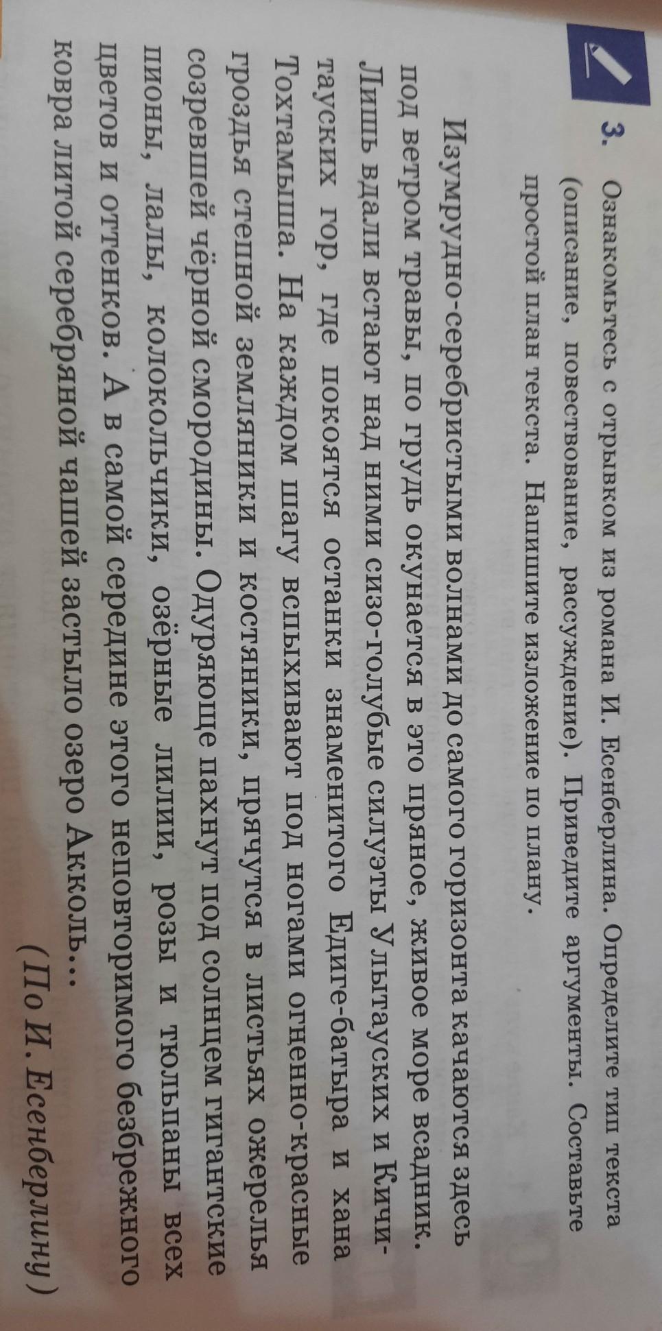 3. Ознакомьтесь с отрывком из романа И. Есенберлина. Определите тип текста (описание, повествование, рассуждение). Приведите аргументы. Составьте простой план текста. Напишите изложение по плану.