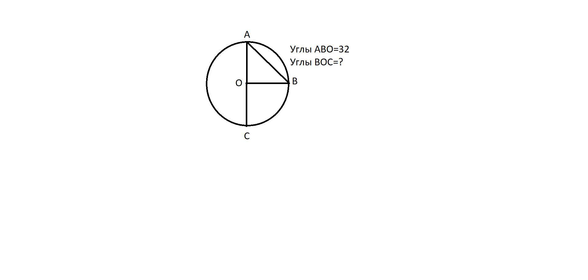 Если угол АВО 32°, то угол ОАВ тоже 32 °, так как эти углы образованы радиусами, значит треугольник равнобедренный. Тогда угол АОВ будет равен: 180° - 32° - 32° = 116° (так как сумма всех углов треугольника 180°)