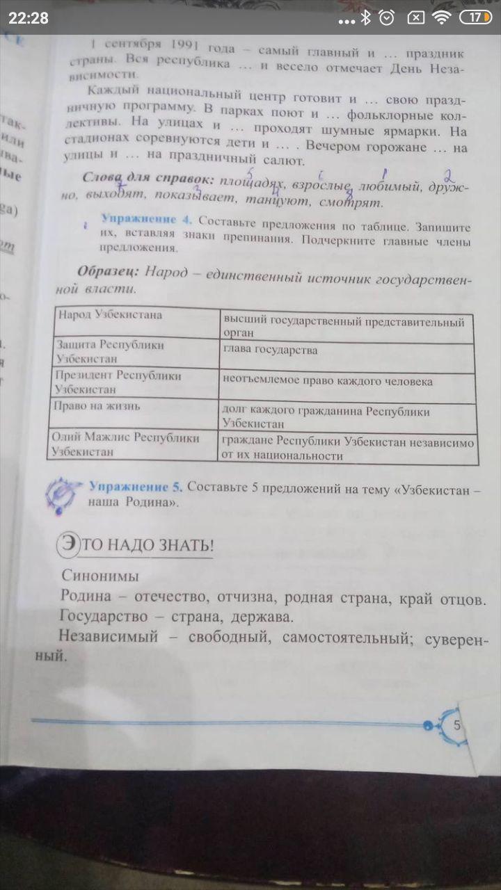 Упражнение 4. Составьте предложения по таблице. Запишите их, вставляя знаки препинания. Подчеркните главные члены предложения. Образец: Народ – единственный источник государственной власти.