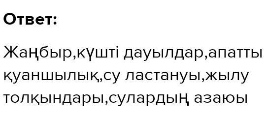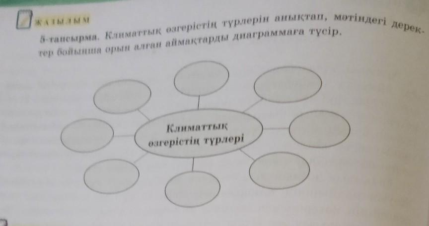 5-тапсырма. Климаттық өзгерістің түрлерін анықтап, мәтіндегі дерек тер бойынша орын алған аймақтарды диаграммаға түсір, климаттық өзгерістің түрлері