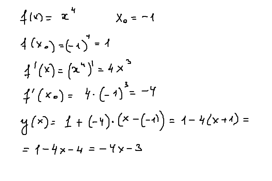 напишите уравнение касательной к графику функции y=f(x) в точку абсцисса который равен икс нулевое f(x)=x4.x 0=-1