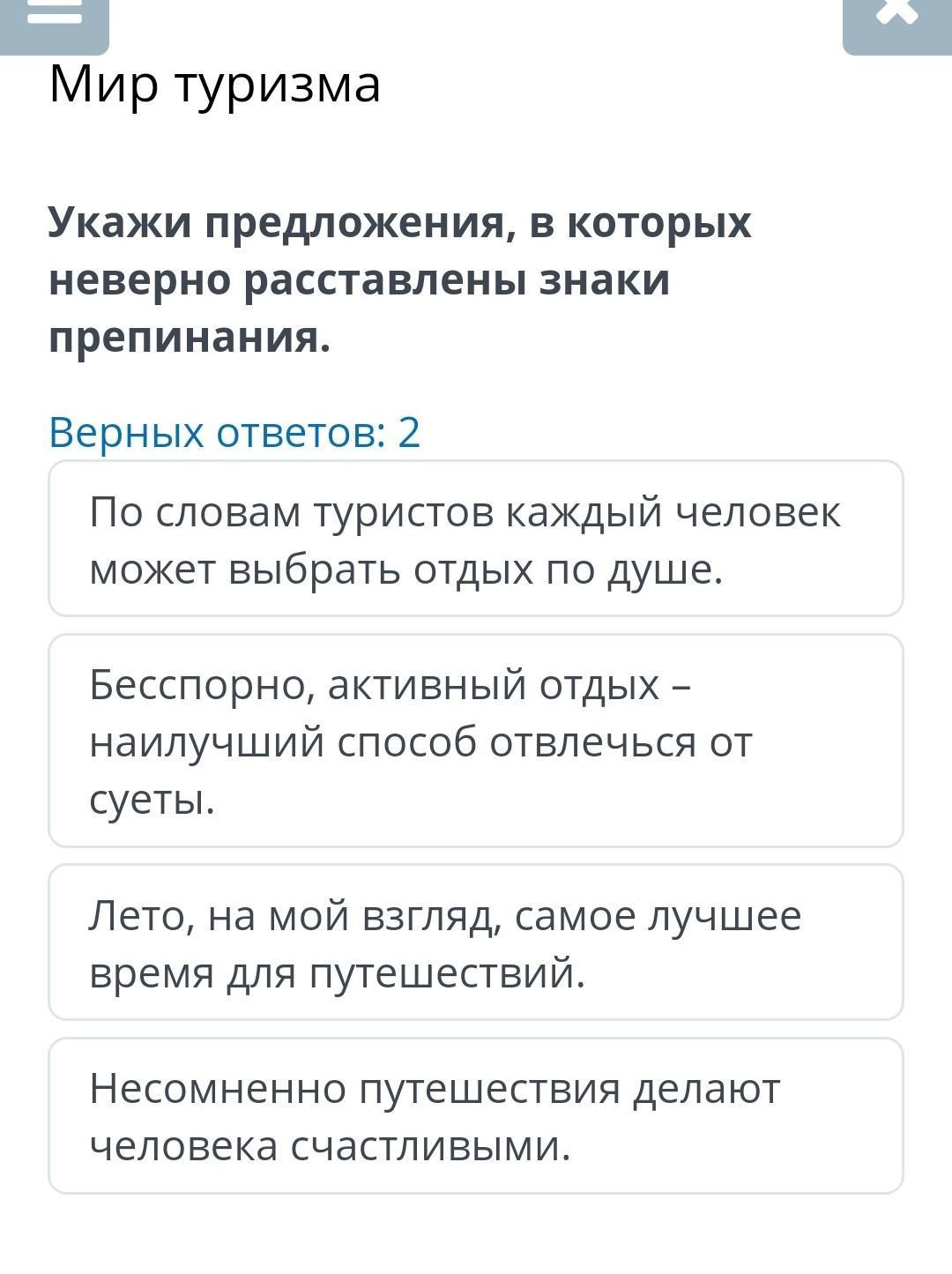 Укажи предложения, в которых неверно расставлены знаки препинания. Верных ответов: 2 По словам туристов каждый человек может выбрать отдых по душе. Бесспорно, активный отдых - наилучший способ отвлечься от суеты. Лето, на мой взгляд, самое лучшее время для путешествий. Несомненно путешествия делают человека счастливыми.