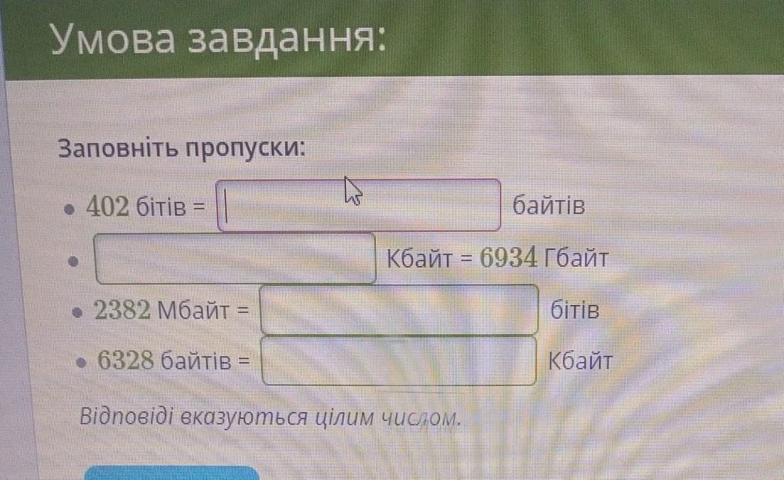 4) 6328 байтів = 6328 / 1024 = 6,18 Кбайт (ціле число: 6 Кбайт)